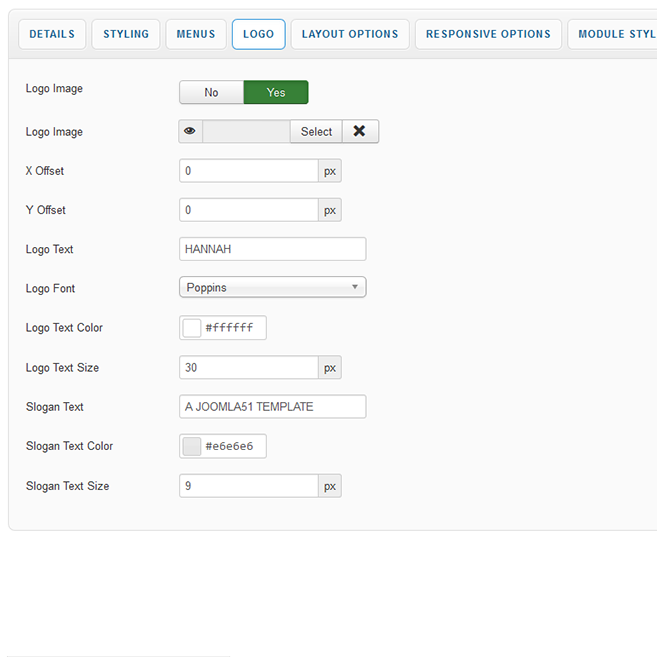 This section of the template parameters allows full control over your site logo with an array of easy to use options. Upload your logo image via the 'Select Logo Image' field and then use the X and Y axis field to tweak its position.