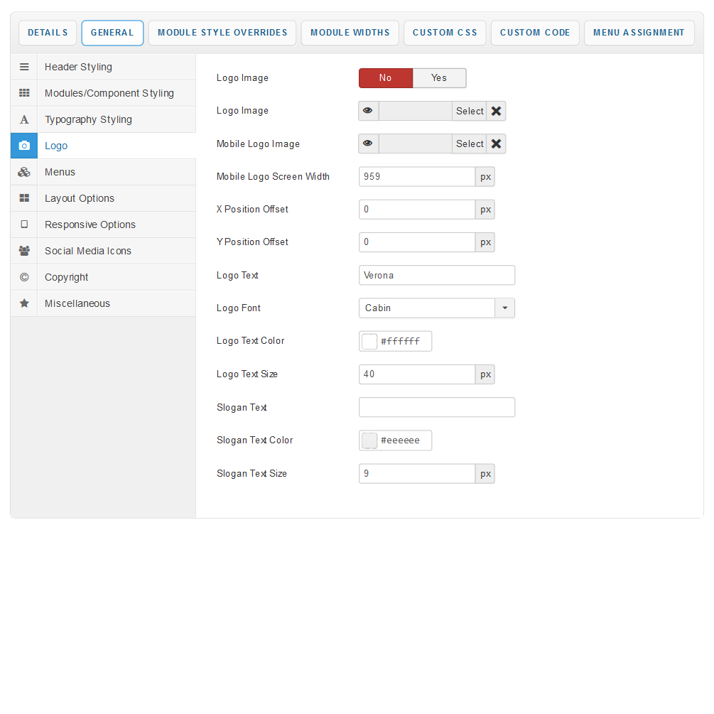 This section of the template parameters allows full control over your site logo with an array of easy to use options. Upload your logo image via the 'Select Logo Image' field and then use the X and Y axis field to tweak its position.