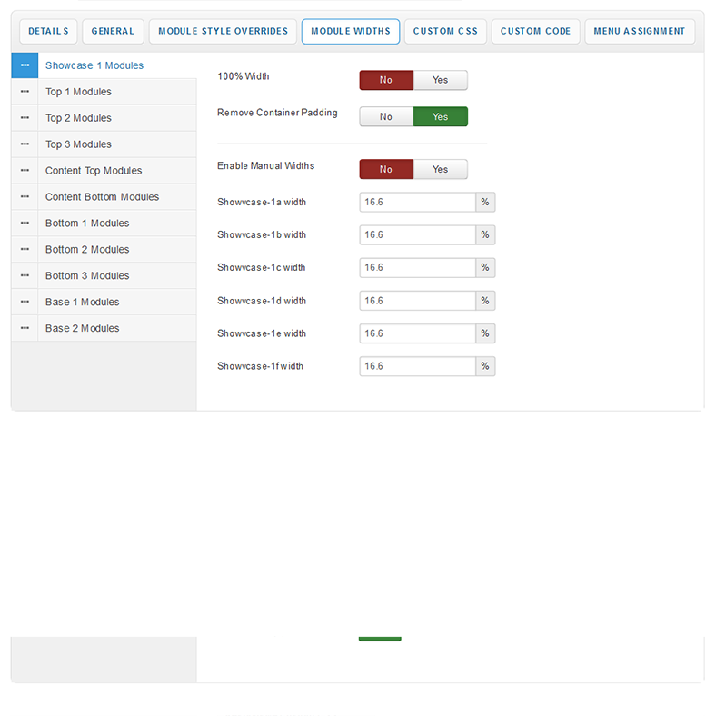 By default your module widths will automatically adjust depending on the number of modules published within its containing row. Via the Module Widths section of the parameters you can now disable this feature and customise the width of each individual module.